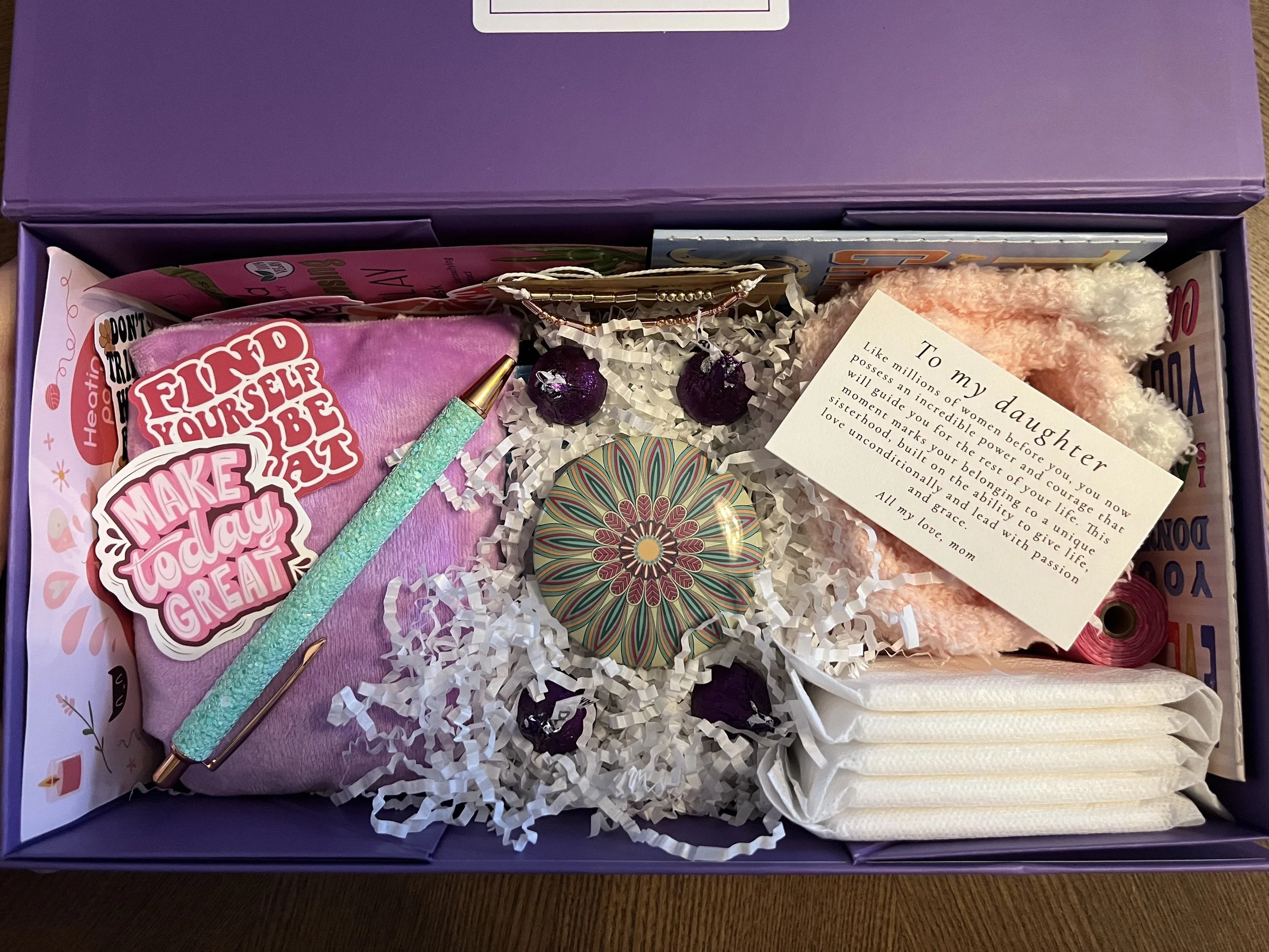 The Bella Box is a great gift to celebrate becoming a young woman and includes organic sanitary napkins, waterproof carrying pouches, fuzzy socks, morse code bracelets, spa supplies and empowering stickers.